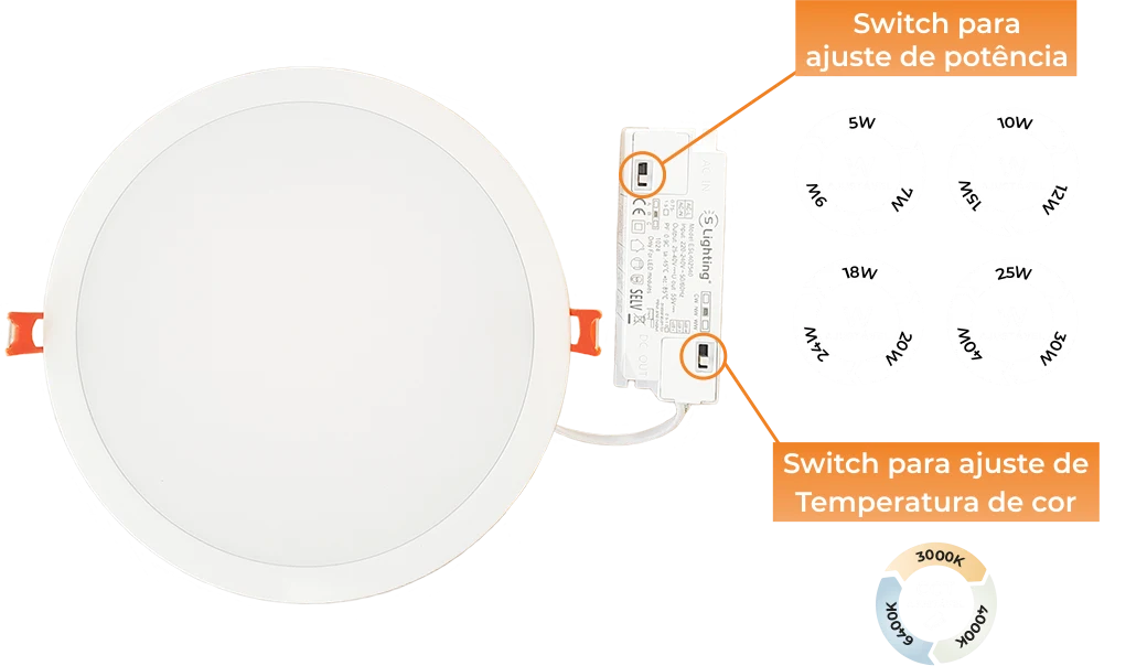 O Downlight LED Redondo 10W-12W-15W 3CCT da S Lighting é uma solução muito prática e versátil, pois permite a regulação da potência e da temperatura de cor. A potência pode ser ajustada para 10W, 12W ou 15W, e a temperatura de cor para 3000K, 4000, 6400K.