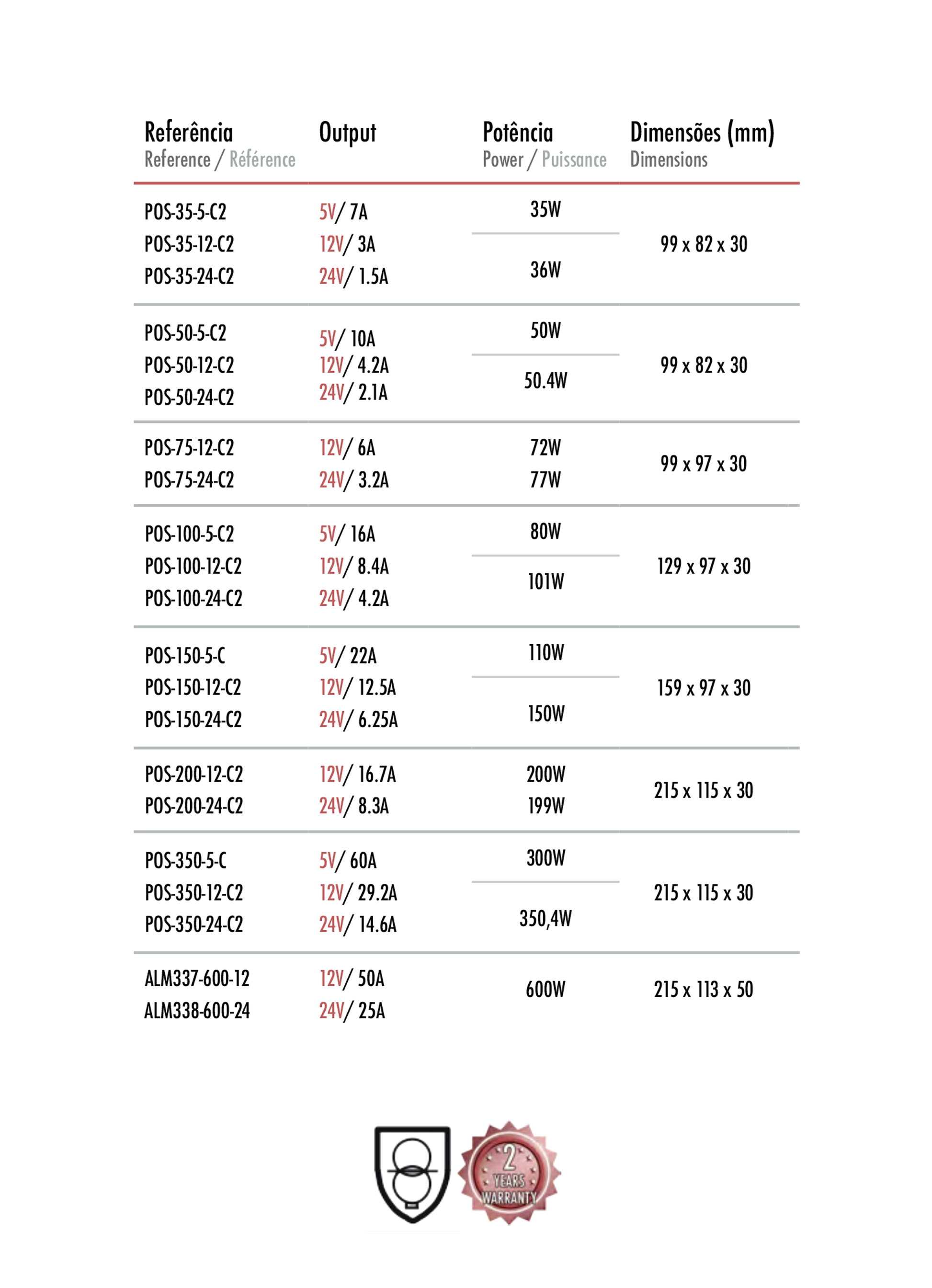 As fontes de alimentação POS INDUSTRIAL estão disponíveis em versões com diferentes correntes máximas de saída e diferentes potências.