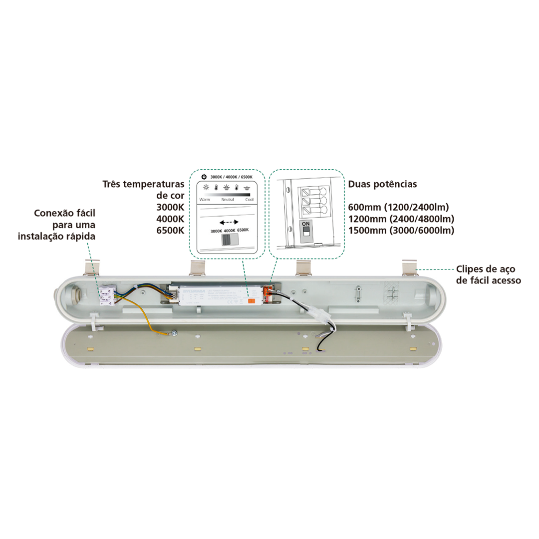 Permite a regulação da potência e vem equipada com sistema CCT, o que lhe possibilita escolher a temperatura de cor (3000K, 4000K ou 6500K) através de um interruptor integrado.