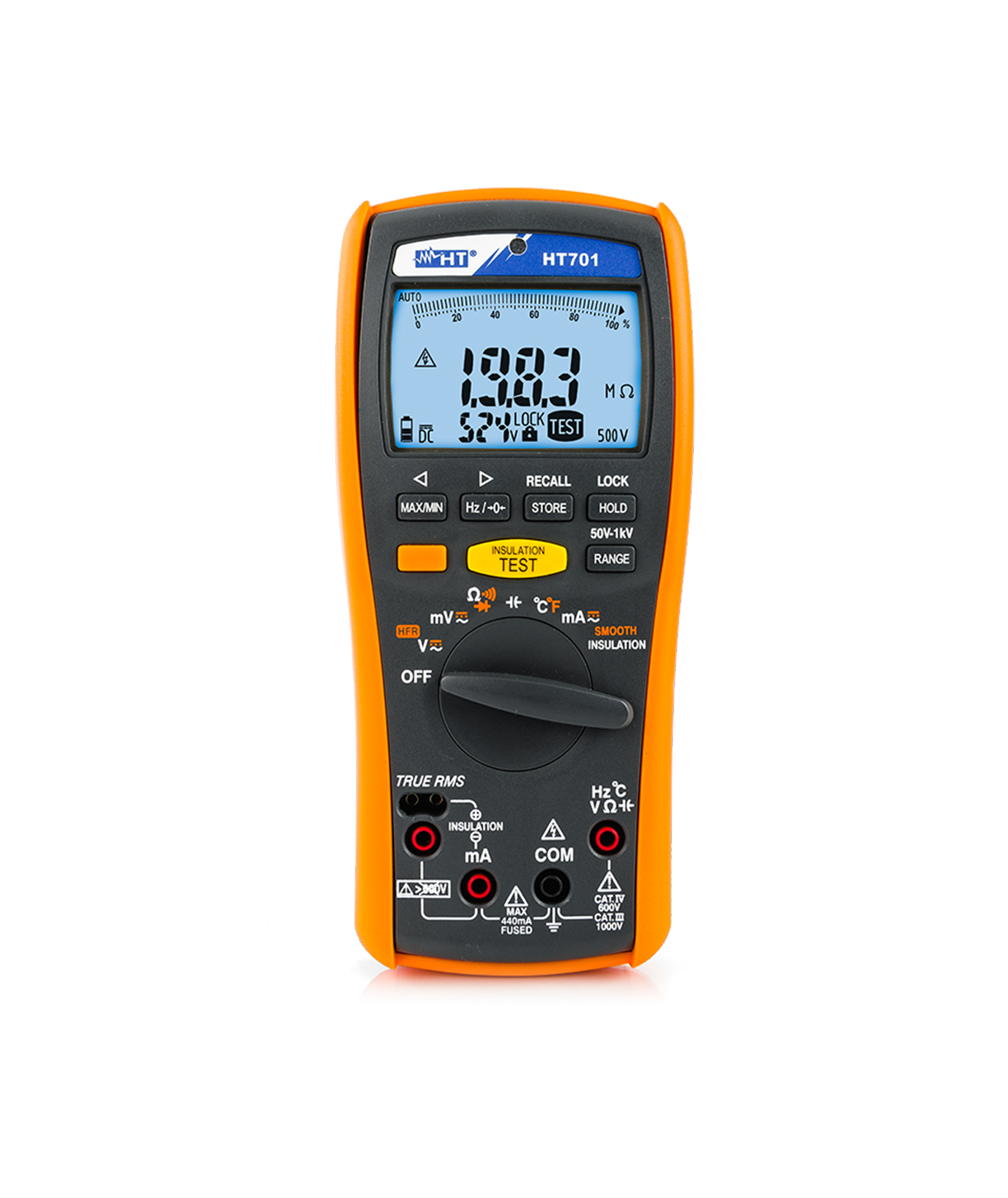 Multímetro profissional TRMS a 10.000 pontos de medição e medidor de resistência de isolamento com tensão de teste selecionável entre 50, 100, 250, 500, 1000VDC. O HT701 é capaz de guardar os resultados das medições na própria memória interna. Fabricado de acordo com as normas de segurança IEC/EN61010-1 em CAT III 1000V e CAT IV 600V com proteção em duplo isolamento.