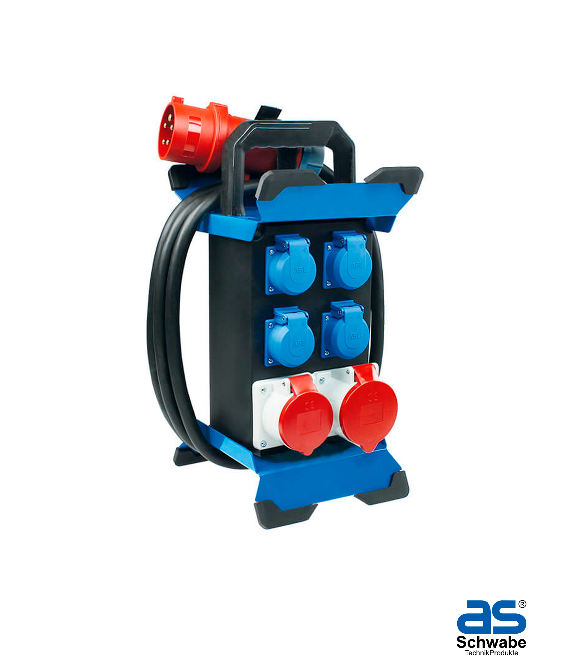 O Stecky 12 da AS Schwabe (referência 60962), é uma caixa de distribuição móvel com 4 Tomadas Schuko 16A e 2 Tomadas CEE (16A | 5P + 32A | 5P).